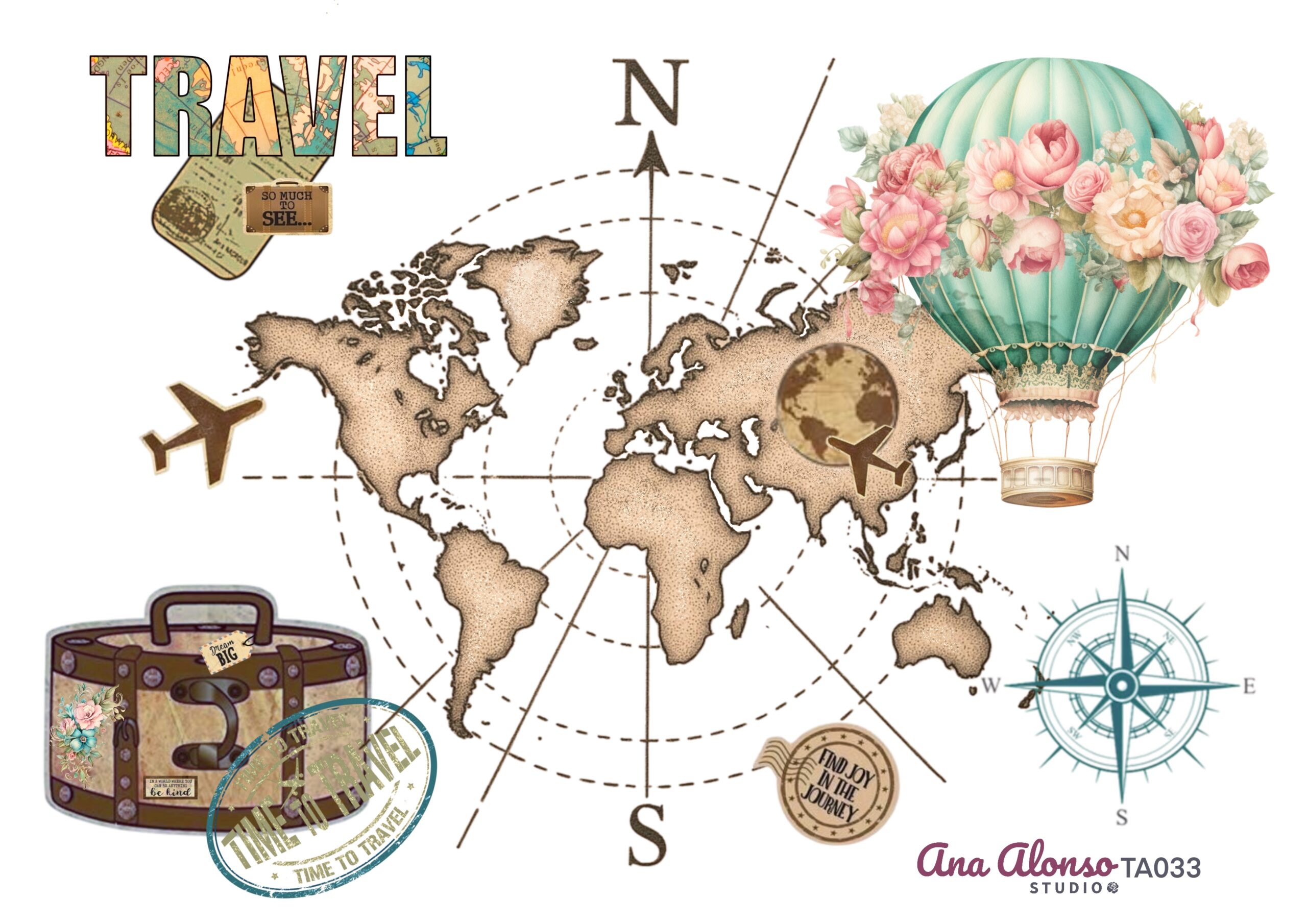 Este Transfer DTF textil representa un globo aerostático adornado con rosas en tonos suaves, acompañado de un mapa con puntos cardinales, brújula y una maleta redonda. La composición transmite equilibrio y un aire nostálgico que encaja especialmente bien en proyectos creativos con inspiración viajera.