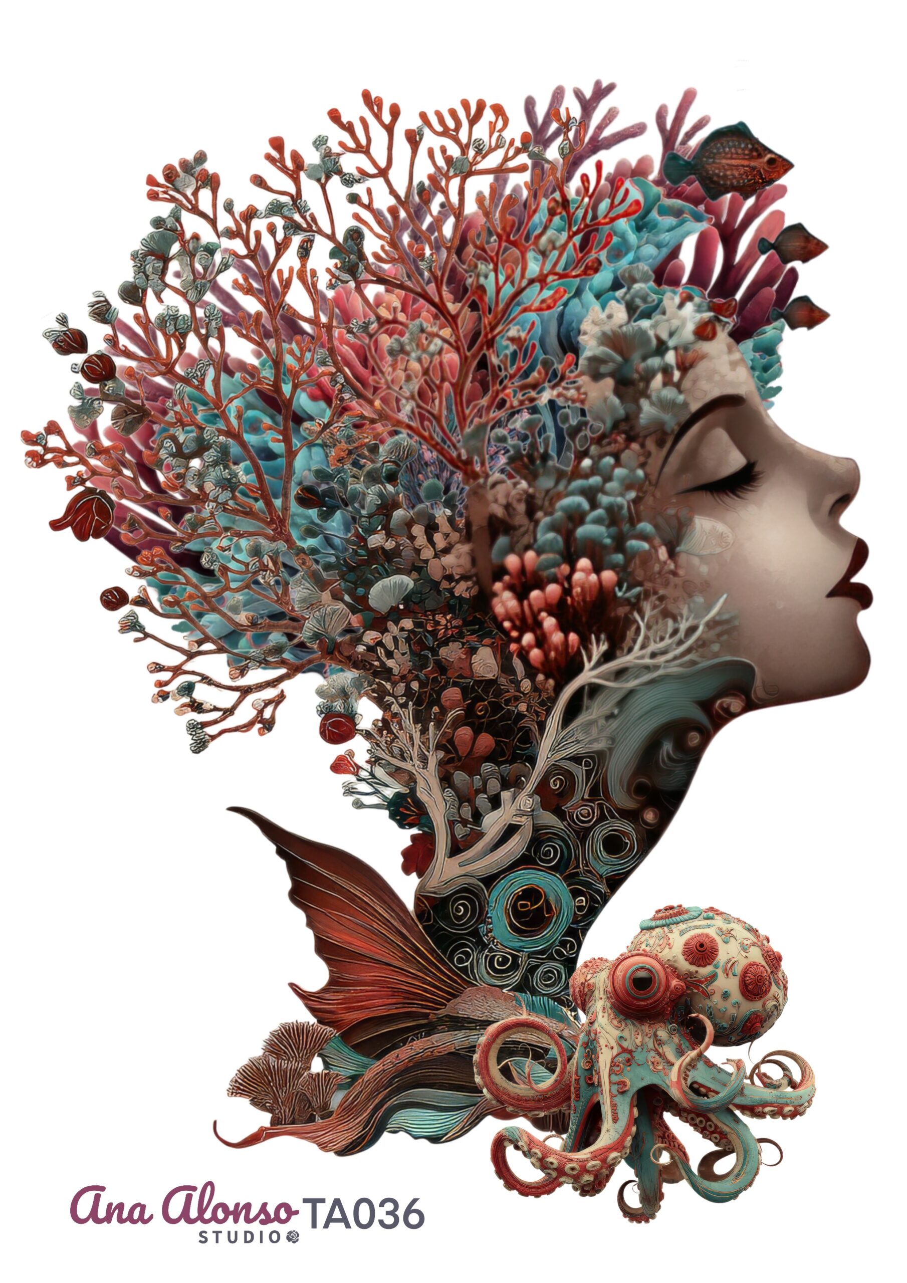 Transfer DTF textil diseñado para aportar carácter a tus prendas mediante una ilustración de mujer con pelo de coral en tonos suaves de rojos, marrones y azul turquesa. La composición, en perfil y con el rostro visible, integra elementos marinos como un pequeño pulpo, esponjas y peces de forma equilibrada, lo que permite que el diseño mantenga una estética limpia y reconocible.