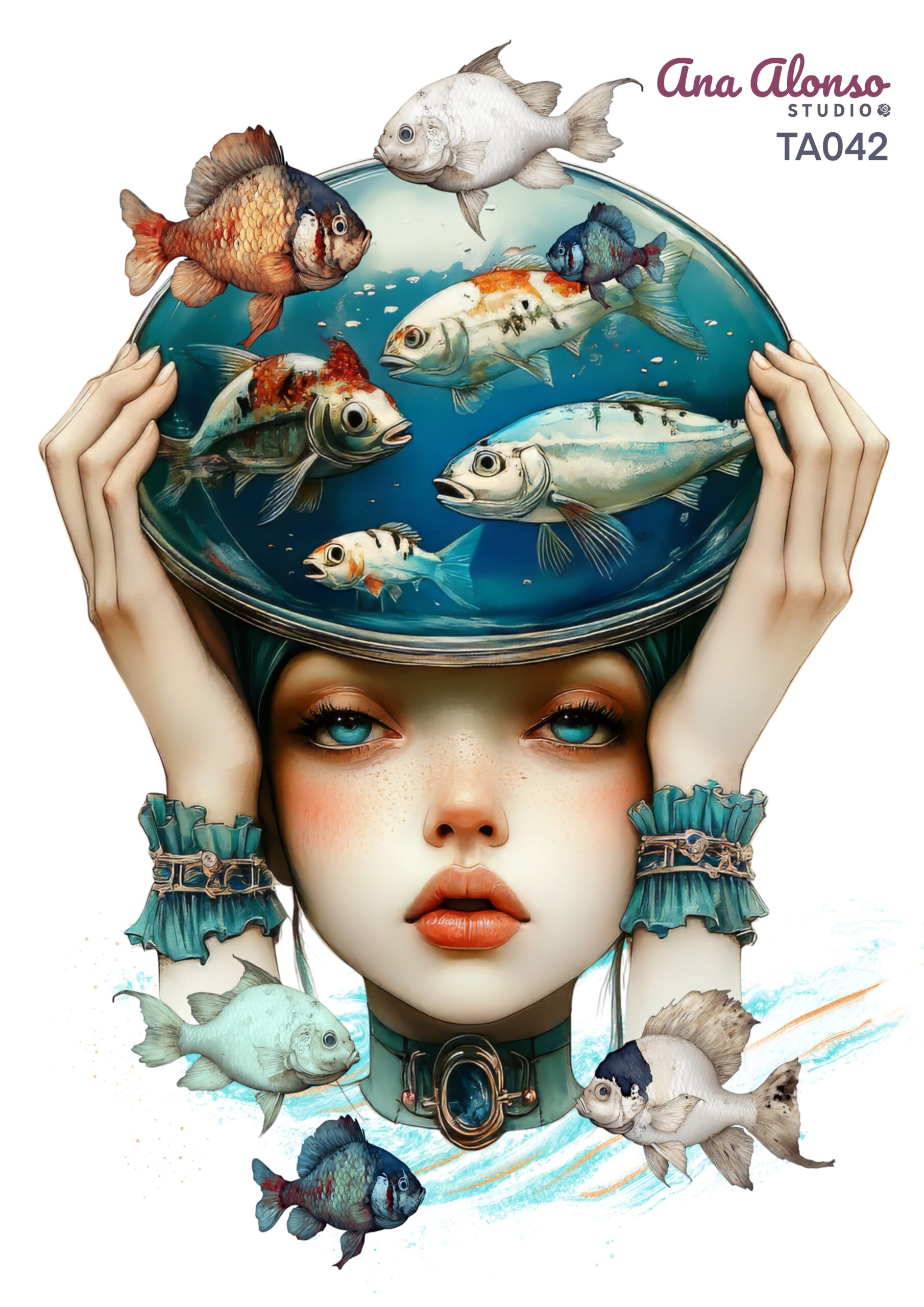 Transfer DTF textil que parece sacado de un sueño: una niña con un acuario en la cabeza donde el azul envuelve su mirada con calma y profundidad. Los detalles de sus pulseras y gargantilla armonizan con el fondo, creando una pieza delicada y muy expresiva. Ideal para proyectos textiles con personalidad propia. Descubre cómo puede transformar tu creación.