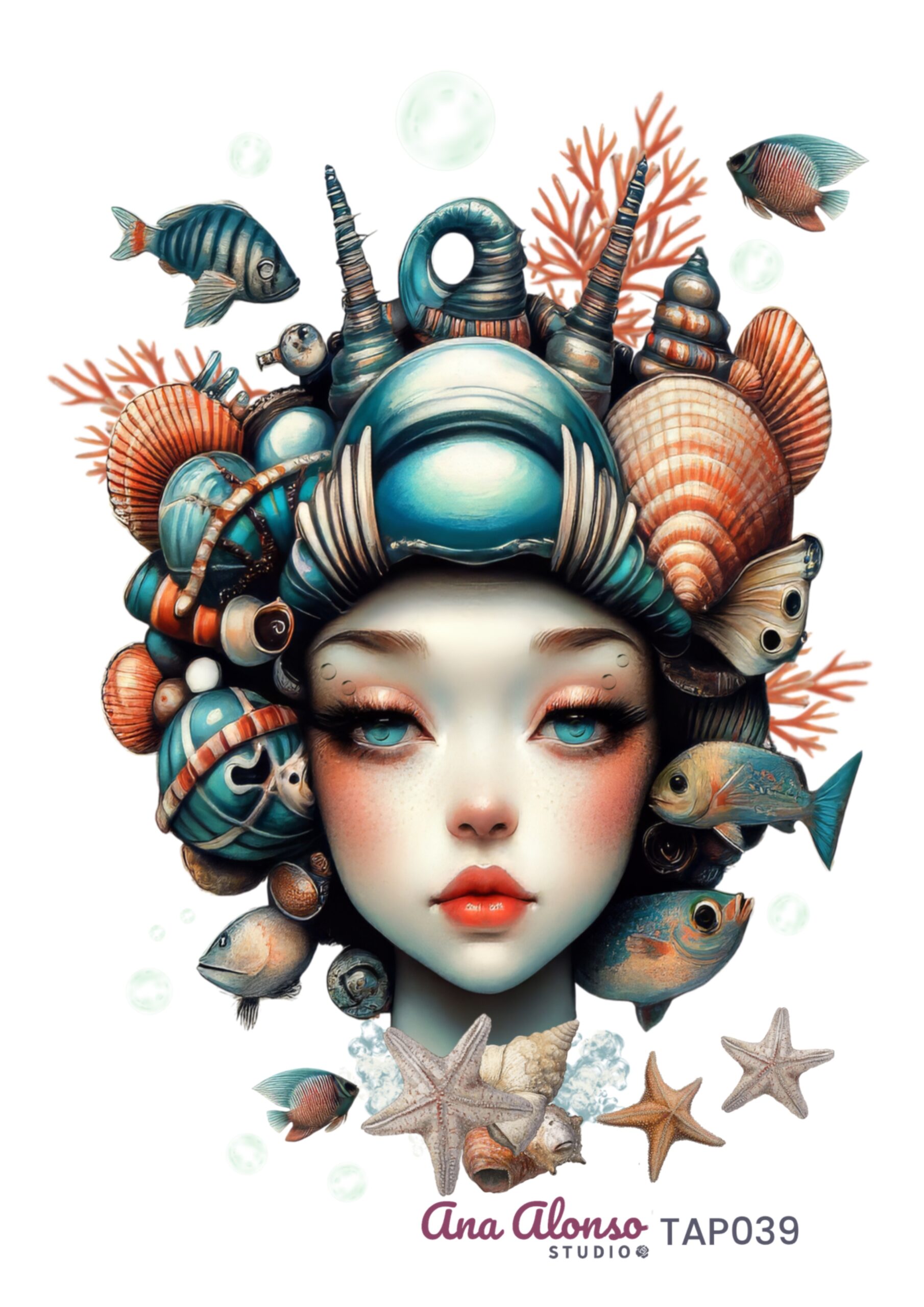 Transfer DTF textil pensado para personalizar prendas con una ilustración evocadora: la niña luce un sombrero compuesto por caracolas de distintos tamaños, en gamas turquesa y coral, con medusas intercaladas y peces jugando a su alrededor. En la garganta, una estrella de mar actúa como gargantilla. Un diseño que suma narrativa visual a tus piezas. Añádelo a tu proyecto y comprueba cómo transforma el resultado.