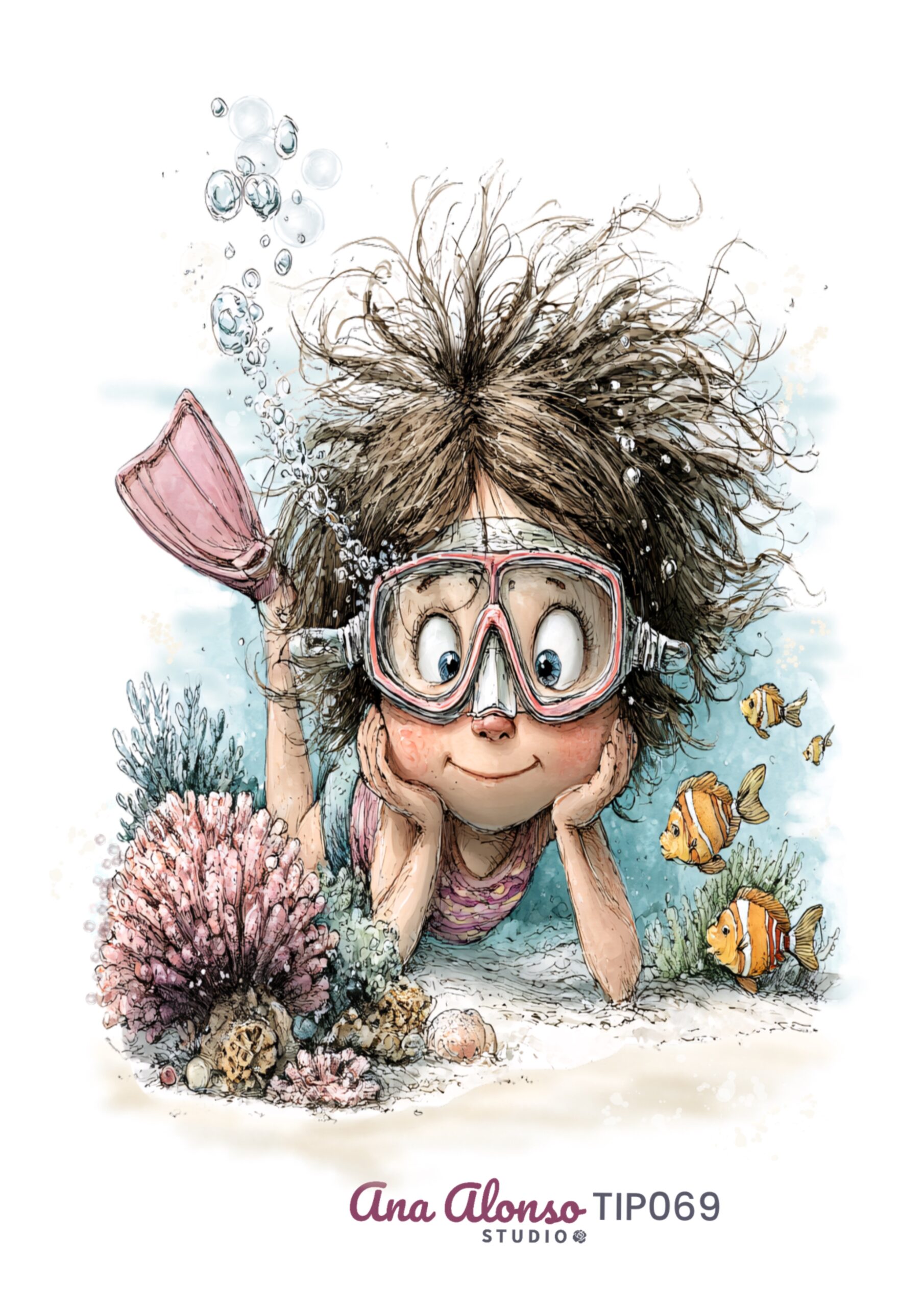 El transfer DTF textil niña descansando en el fondo del mar invita a interpretar la escena desde la calma y la observación. Es una opción interesante para quienes valoran los detalles ilustrados y buscan transmitir emociones suaves en sus creaciones.