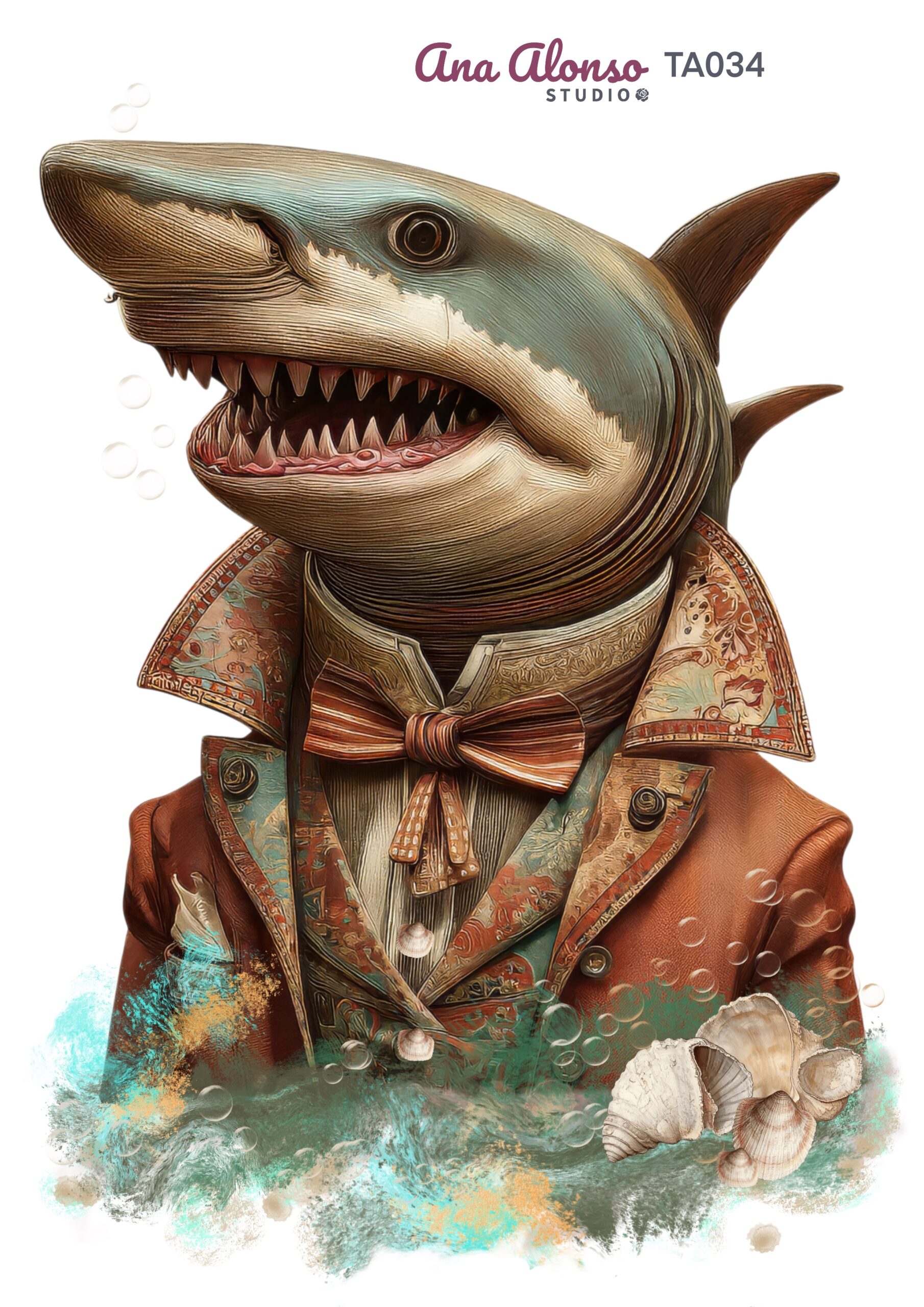 Transfer DTF textil que parece sacado de una historia imposible: un tiburón elegante, con pajarita y chaqueta, emerge del mar como si tuviera algo importante que contar. Su aire distinguido y el guiño surrealista lo convierten en una pieza que no pasa desapercibida. Ideal para dar personalidad a tus proyectos textiles. Descubre cómo encaja en tu próxima creación.