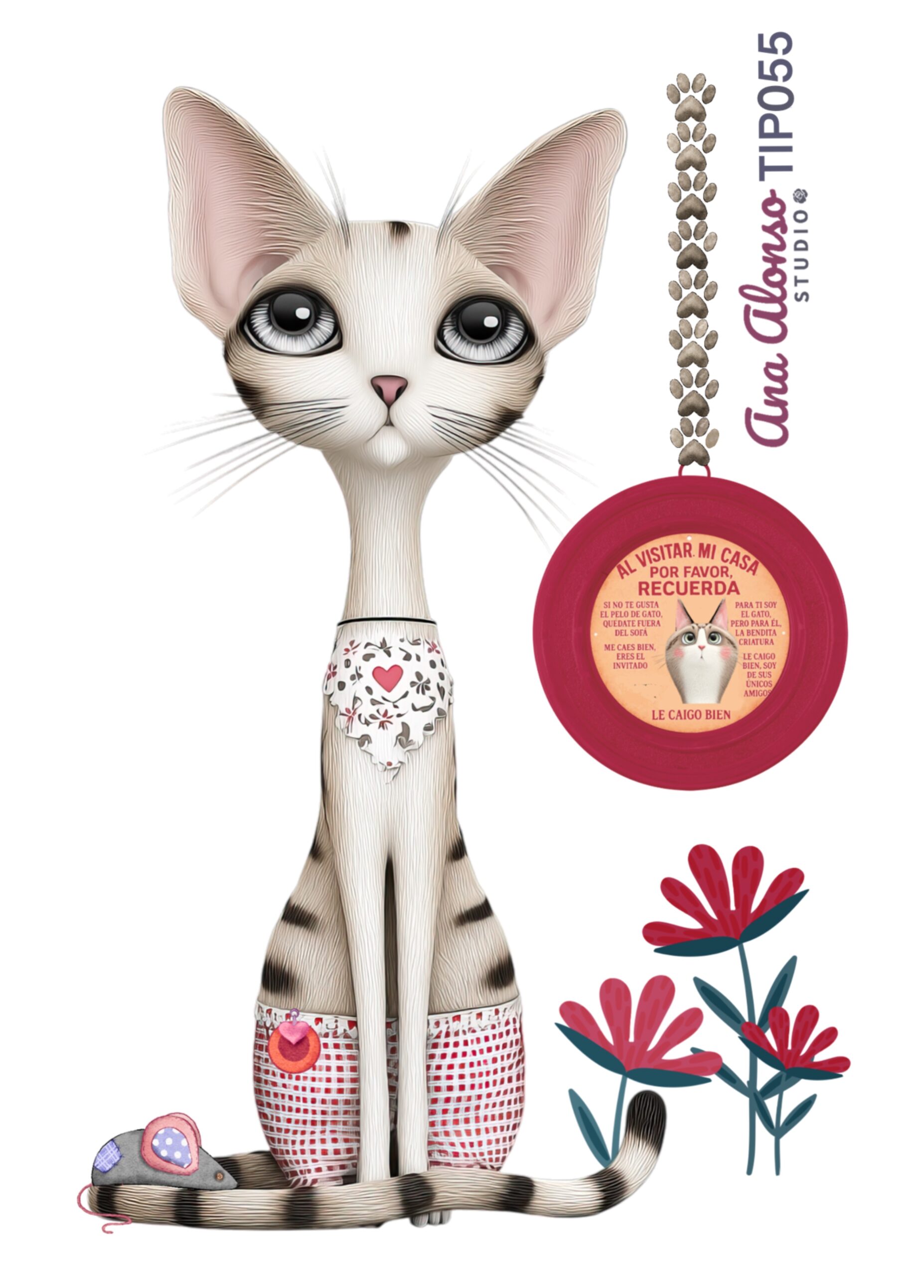 El transfer gato visita mi casa presenta una ilustración entrañable protagonizada por un gato y un ratón sujetando un cartel con el mensaje “visita mi casa”. Es una propuesta perfecta para quienes buscan un acabado decorativo con carácter artesanal y un aire cercano.