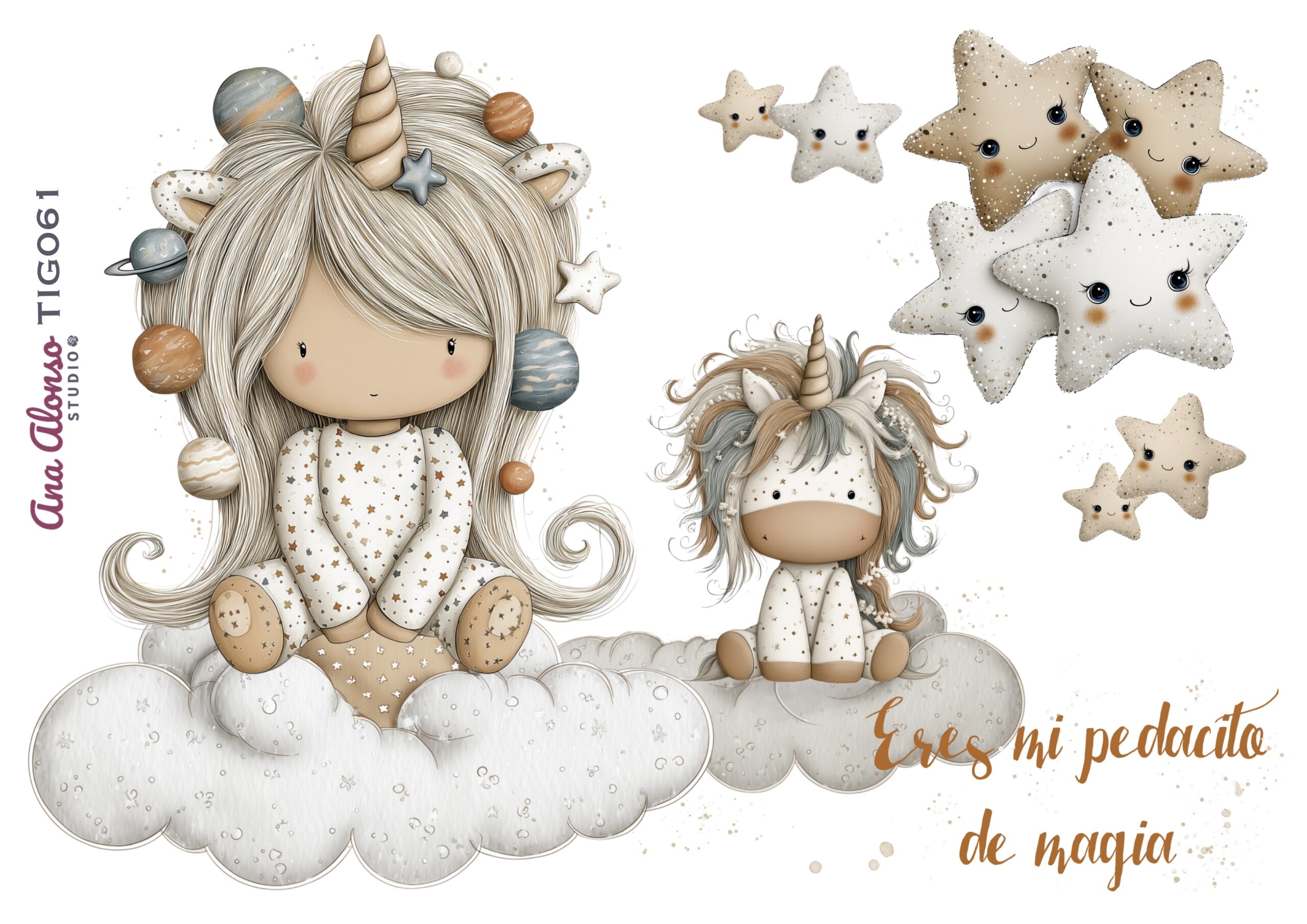 Había una vez una pequeña escena que parecía salida de un cuento: una niña sentada en una nube, su unicornio a su lado y un cielo salpicado de estrellas. Ese instante, ahora, puede formar parte de tu proyecto textil.