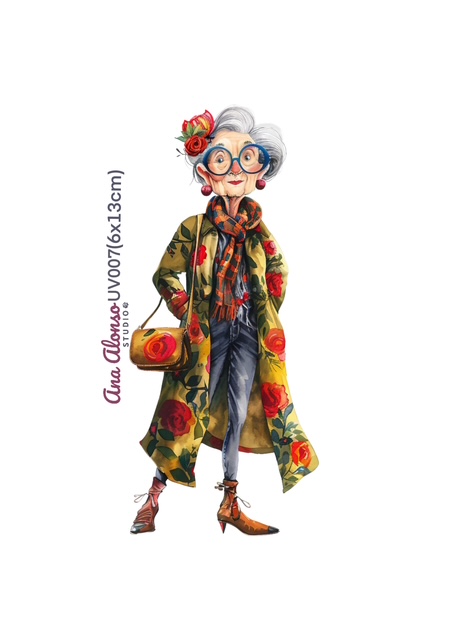 Hay personajes que cuentan historias sin decir una palabra. Esta abuela con bolso de flores y bufanda a cuadros parece salir de un paseo tranquilo entre jardines. Su diseño cálido aporta un toque entrañable a tus proyectos creativos con transfer UV DTF. Ideal para personalizar superficies lisas con carácter. Descubre cómo integrarlo en tu próxima creación.