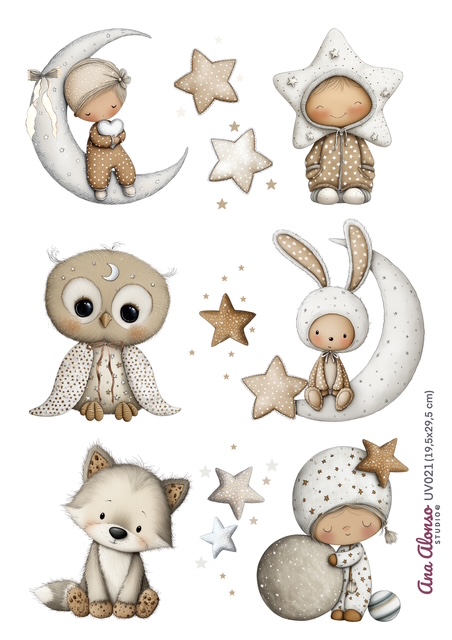 Transfer UV DTF Que cuenta que al caer la noche, cuatro pequeños amigos se reúnen sobre una media luna mientras un búho vigila y un gato observa en silencio. Las estrellas parecen susurrar historias que invitan a imaginar. Este Transfer UV DTF captura esa escena delicada, perfecta para aportar un aire poético a tus proyectos. Su composición equilibrada facilita integrarlo en diferentes superficies. Añádelo a tu colección y crea piezas con encanto.