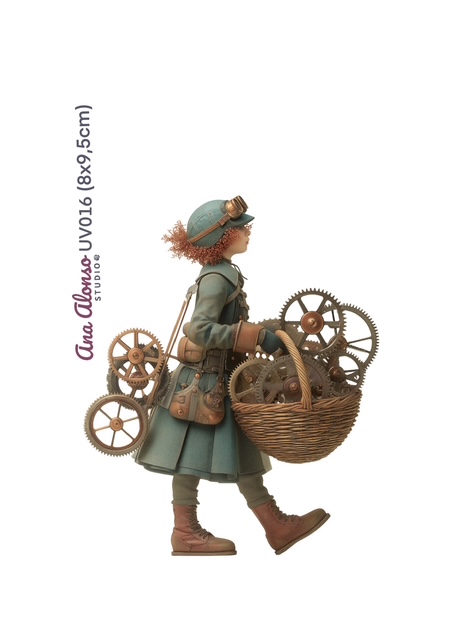 Este Transfer UV DTF presenta una ilustración cuidada de una niña con estética stempunk: abrigo verde, gafas de aviador y gorro, acompañada de engranajes que transporta en un cesto y a la espalda. Una escena que sugiere ingenio, curiosidad y un universo mecánico lleno de detalles.