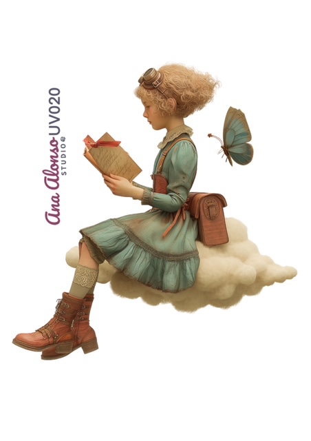 Transfer UV DTF con ilustración de niña pelirroja sentada en una nube leyendo un manuscrito, con botas de cuero marrón y una mariposa a juego con su vestido. Un diseño delicado y narrativo para dar personalidad a tus proyectos creativos. Añádelo a tu colección y crea piezas únicas con tu estilo.