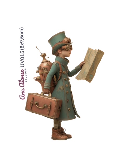 Transfer UV DTF con ilustración de niño con abrigo verde, botas marrón, sombrero de copa y gafas de aviador, acompañado de maleta y mapa. Un diseño con aire viajero que aporta carácter a tus piezas. Ideal para proyectos creativos con personalidad. Descubre cómo integrarlo en tus creaciones.