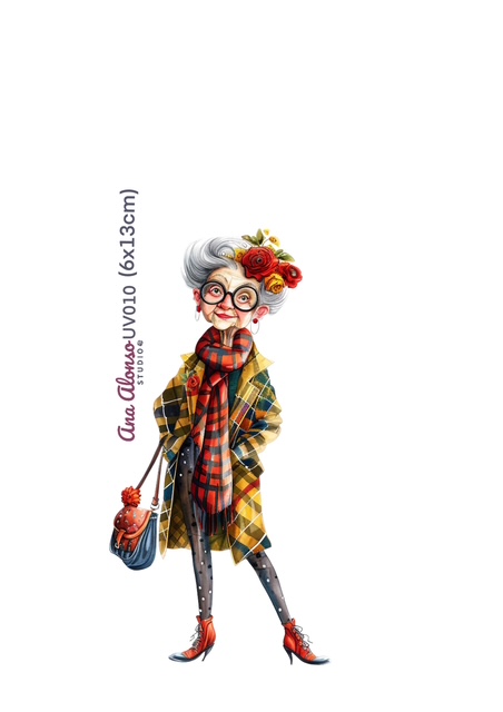 Inicio » Tienda » UV » Transfer UV DTF «abuela con leggins de lunares, flores en el pelo y pendientes de aro»